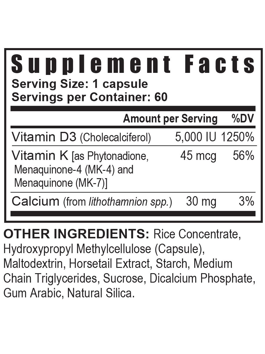Who’s it for: Anyone looking to add extra Vitamin D to their diet to support their health goals. What does it do: Delivers 5,000 IU of Vitamin D plus cofactors to support immune function, the cardiovascular system, and bone health. What sets this product apart: Ultimate Vitamin D3 contains Vitamin D along with Vitamin K, which is nutrient that works synergistically to help with calcium transportation and absorption. Ingredient/Benefit PRODUCT BENEFITS Vitamin D3 Known to support optimal bone and joint health. 1 Vitamin K Plays a role in healthy blood clotting, bone metabolism, and regulating blood calcium levels. 2 Calcium Helps support optimal bone and joint health.