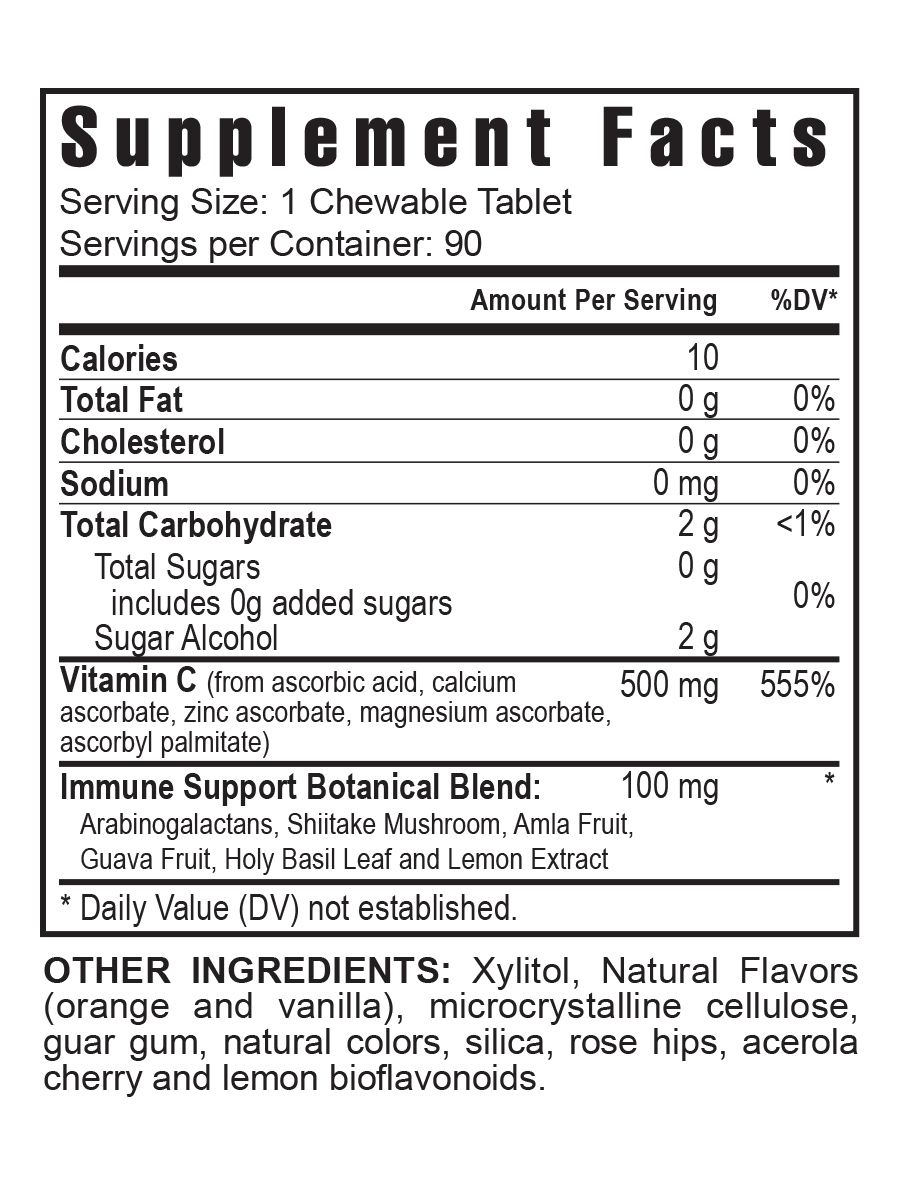 Ingredients: Vitamin C, Immune Supporting Botanica Blend [Arabinogalactans, Shitake Mushroom, Amla Fruit, Guava Fruit, Holy Basil Leaf and Lemon Extract], Xylitol, Natural Flavors (orange and vanilla) microcrystalline cellulose, guar gum, natural colors, silica, rose hips, acerola cherry and lemon bioflavonoids.