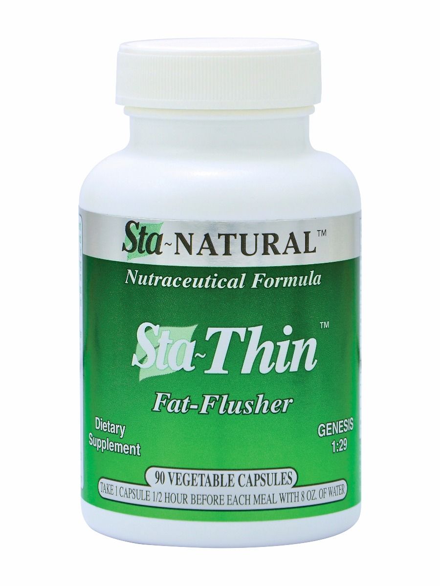 Sta-Thin™ patented ingredients will suppress the appetite. Sta-Thin™ traps the fat and flushes it through the body’s system. 90 vegetable capsules